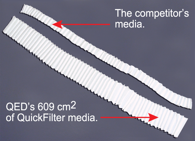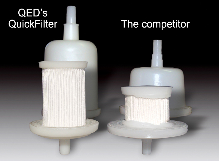 Cartridge filters may look alike, but be careful to compare media type, surface area and the fine print of the purity verification program. Only QuickFilter delivers the full premium package, at no extra charge. QuickFilter® cartridges are the original ground water sampling filter for field use, developed to meet the stringent purity requirements of sensitive ground water quality monitoring programs. When sample filtration is required, disposable QuickFilter cartridges are easier to use, faster, and provide more consistent results than other filtration methods. When used directly in-line with a proper sampling pump, QuickFilters cartridges provide additional benefits of eliminating sample alteration due to air contact and/or sample quality changes with time and temperature. Only QED QuickFilter® cartridges deliver the full-rated filtration area that you pay for. If you look inside the capsule, you will find that QuickFilters cartridges contain a full 609 cm2 polyethersulphone media. Many of our competitors claim the same media surface area, but some contain only half that. The QuickFilter media provides maximum flow capacity and superior filtration even in highly turbid waters.